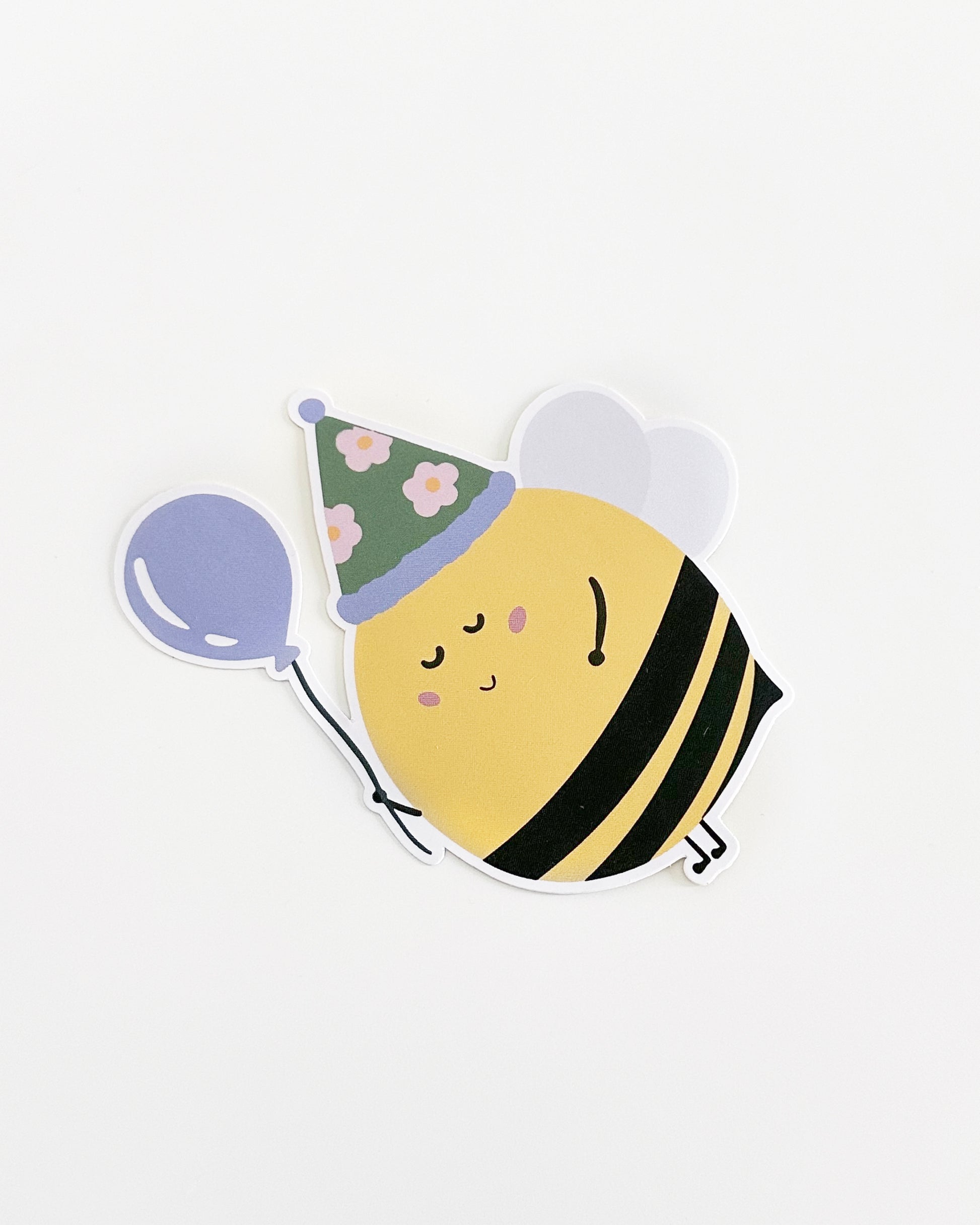 Featuring Beeatrice the Bee, holding a festive balloon and wearing a birthday hat, perfect for brightening up any celebration-themed gift or stationery set.