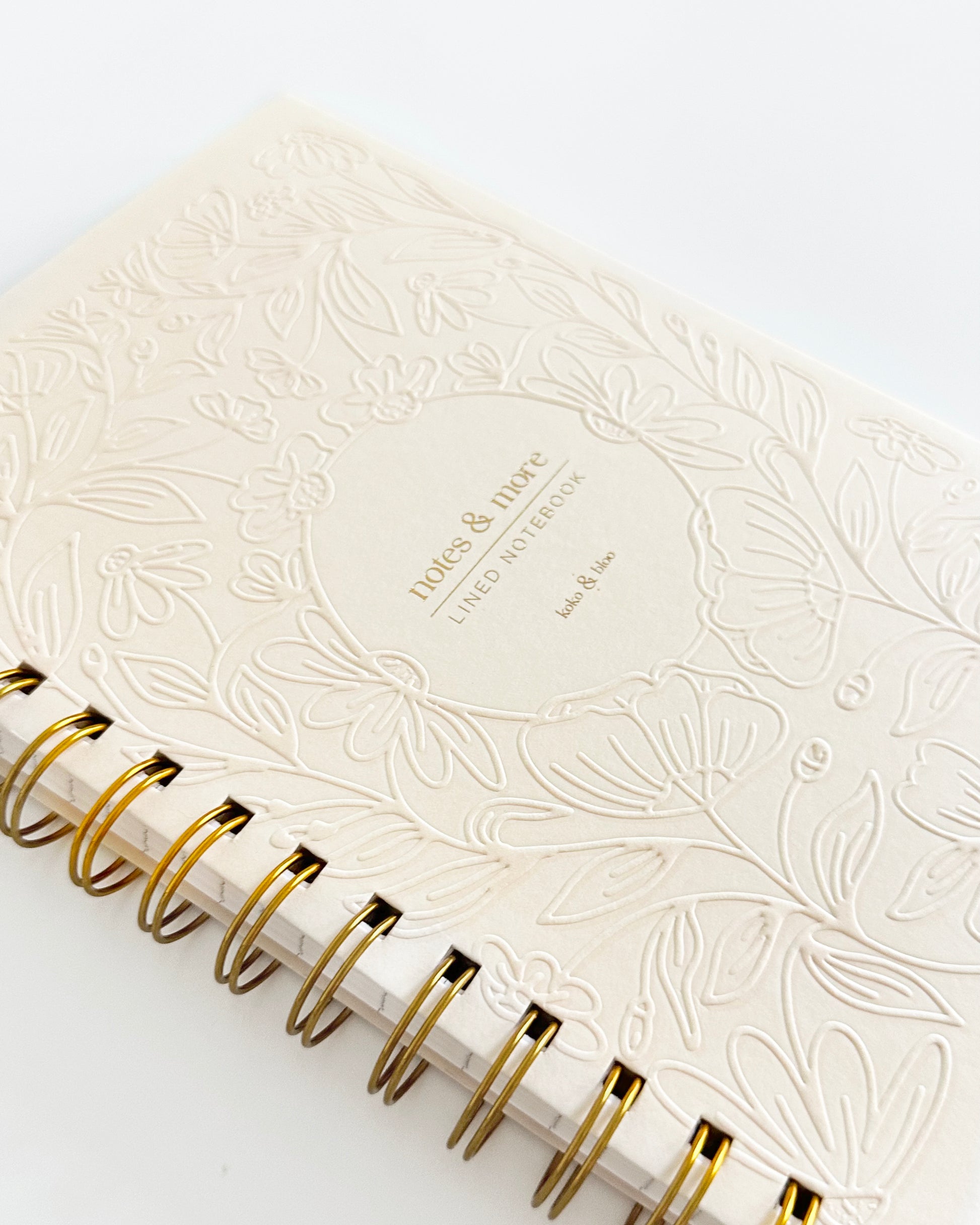 Stay organized in style with our spiral notebook. Featuring an embossed floral cover and a luxurious gold spiral binding, this A5-sized notebook is as elegant as it is practical. Perfectly suited for work, study, or journaling, its timeless design will elevate your stationery collection.