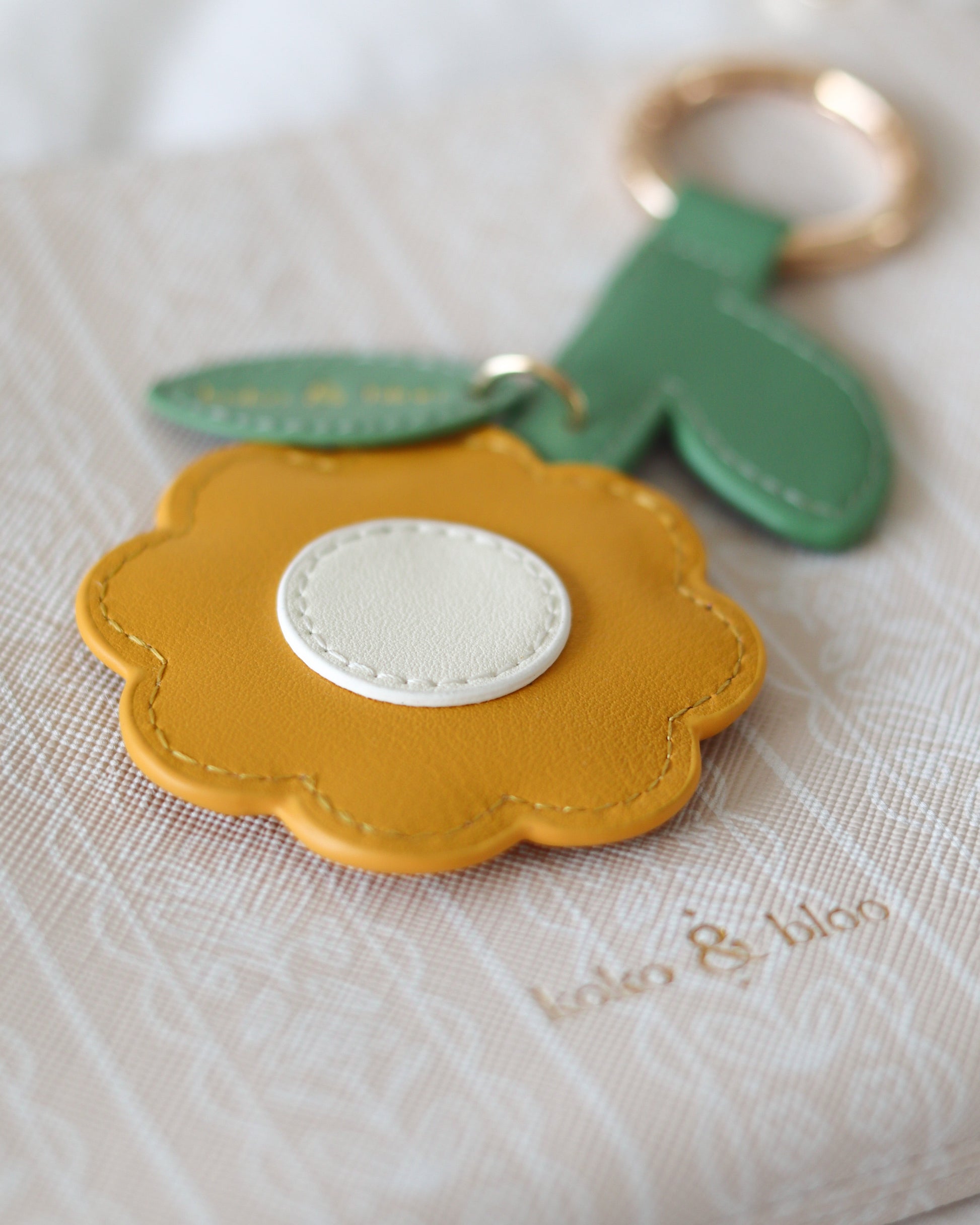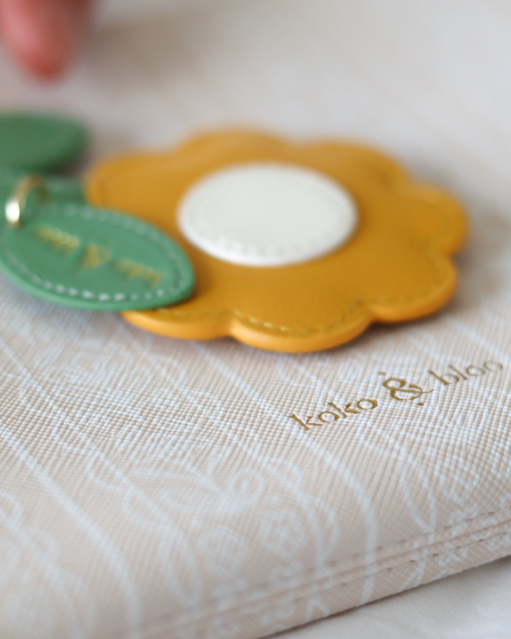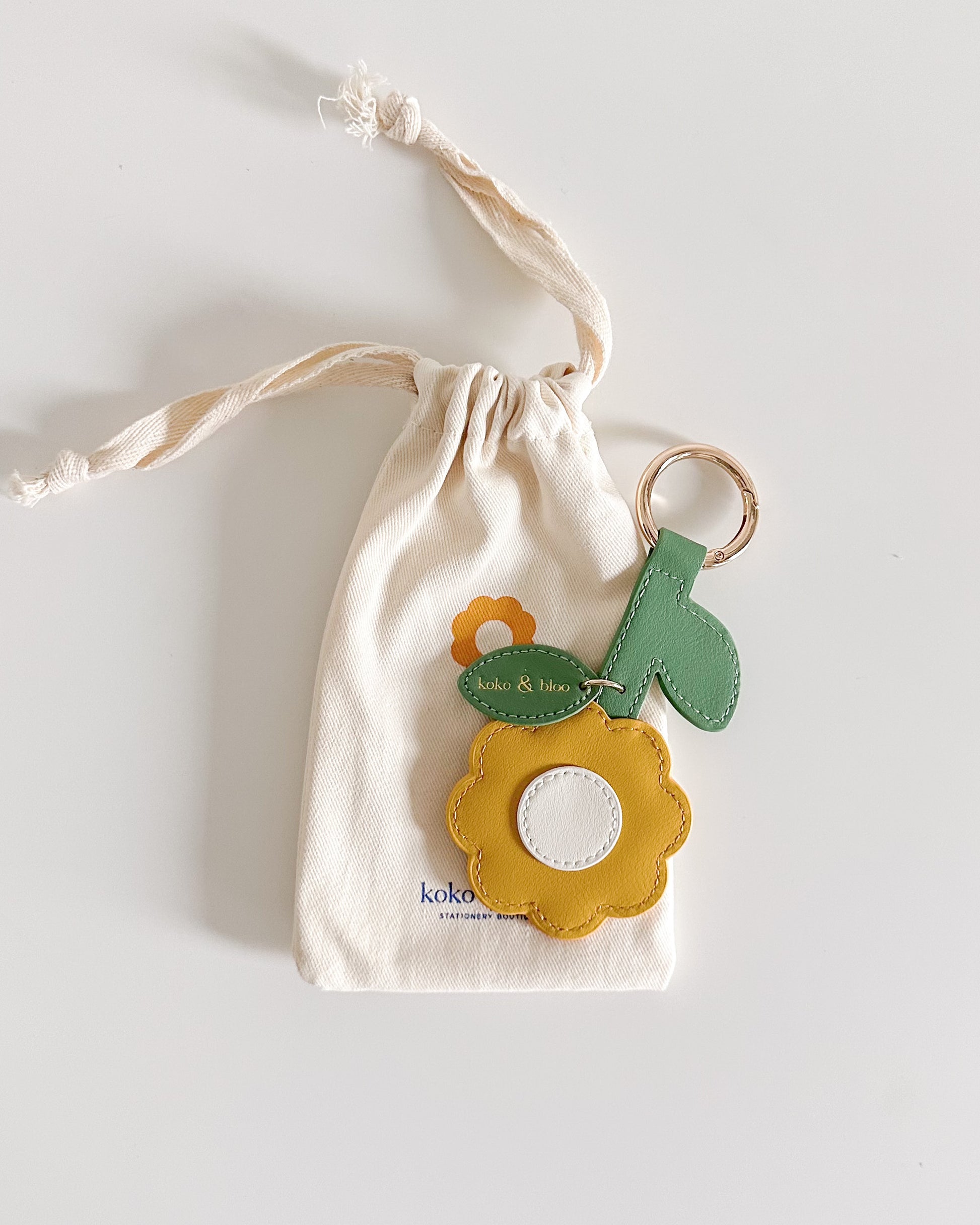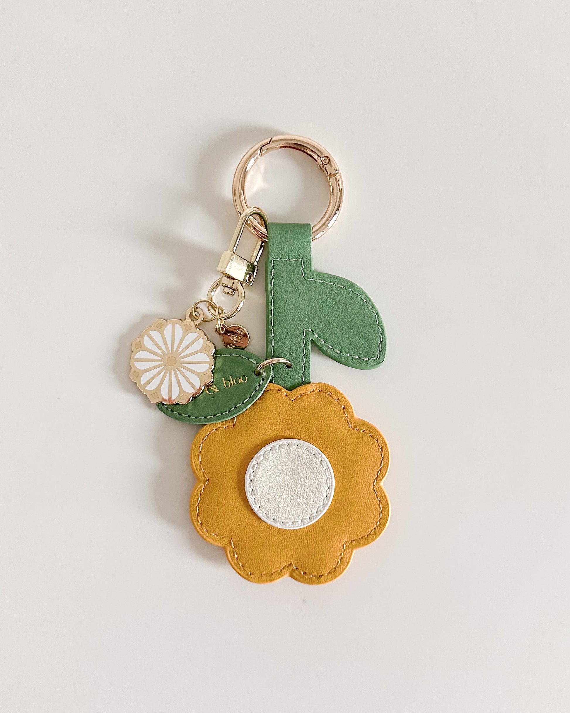 Add a soft floral touch to your everyday accessories with our vegan-friendly leather in Yellow. This puffy charm features a sweet flower with a stem and two leaves, one delicately embossed with our logo in gold foil for that extra special detail.