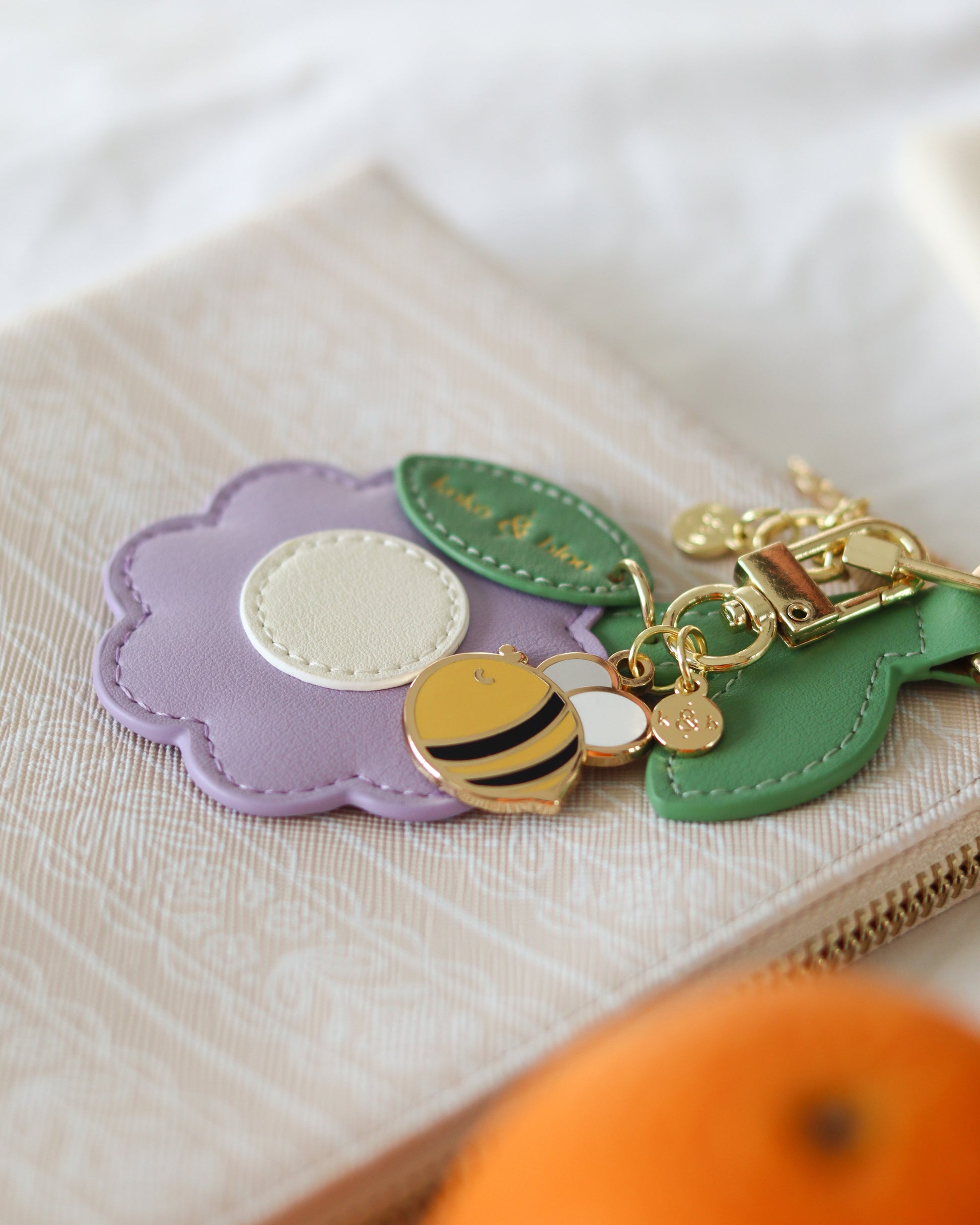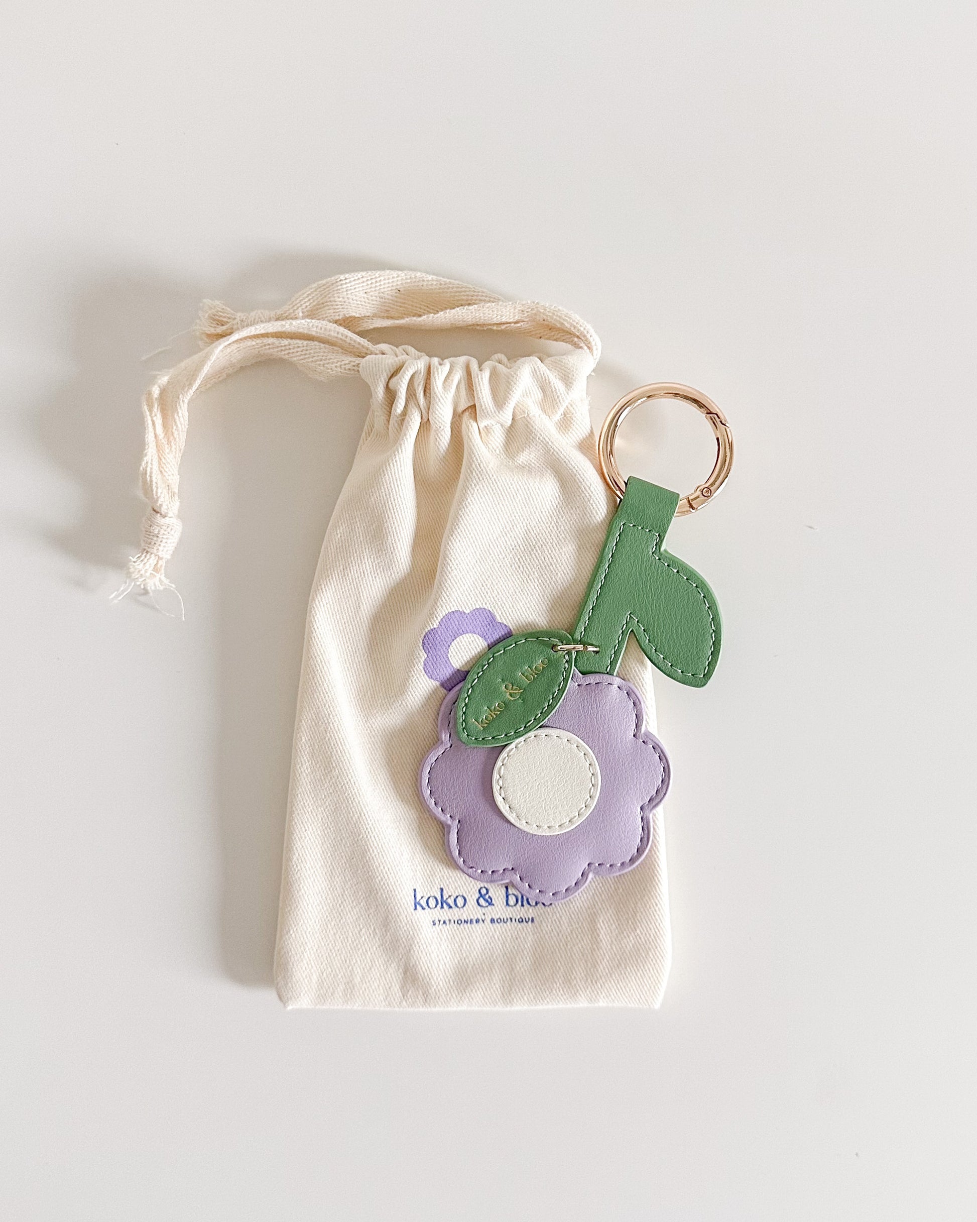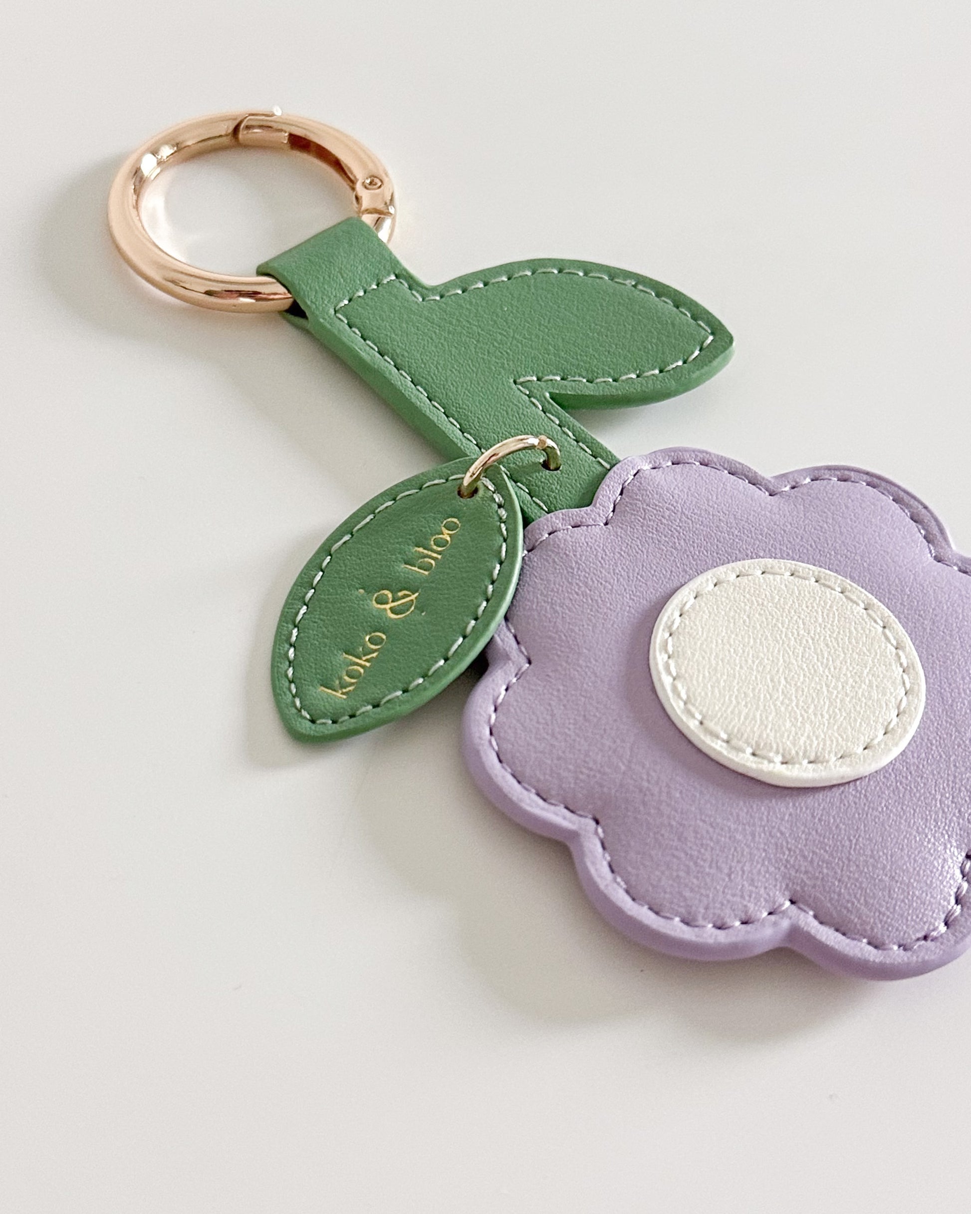 Add a soft floral touch to your everyday accessories with our vegan-friendly leather in Lilac purple. This puffy charm features a sweet flower with a stem and two leaves, one delicately embossed with our logo in gold foil for that extra special detail.