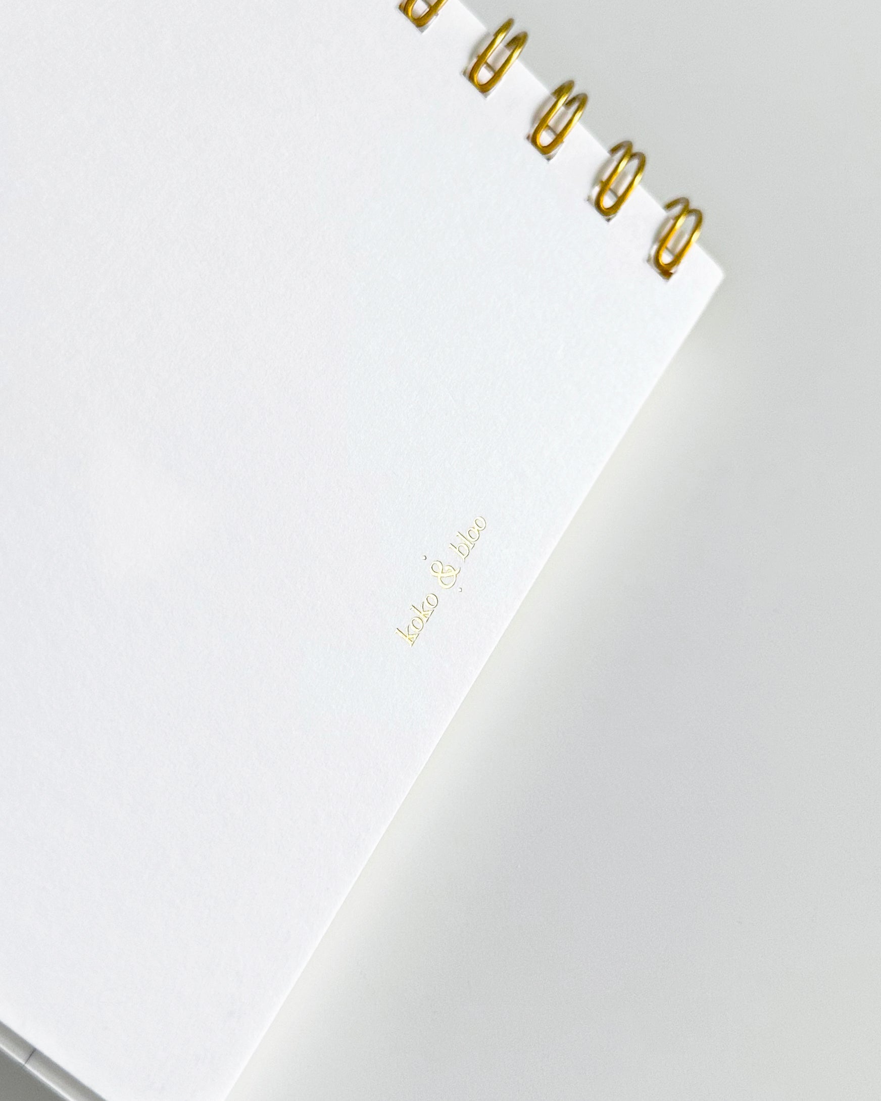 A5 gold spiral notebook. Thick 600gsm cover with hot foil and floral embossed details. 200 easy-tear, lined pages with one thick paper divider in the middle. Available in 3 colour options.
