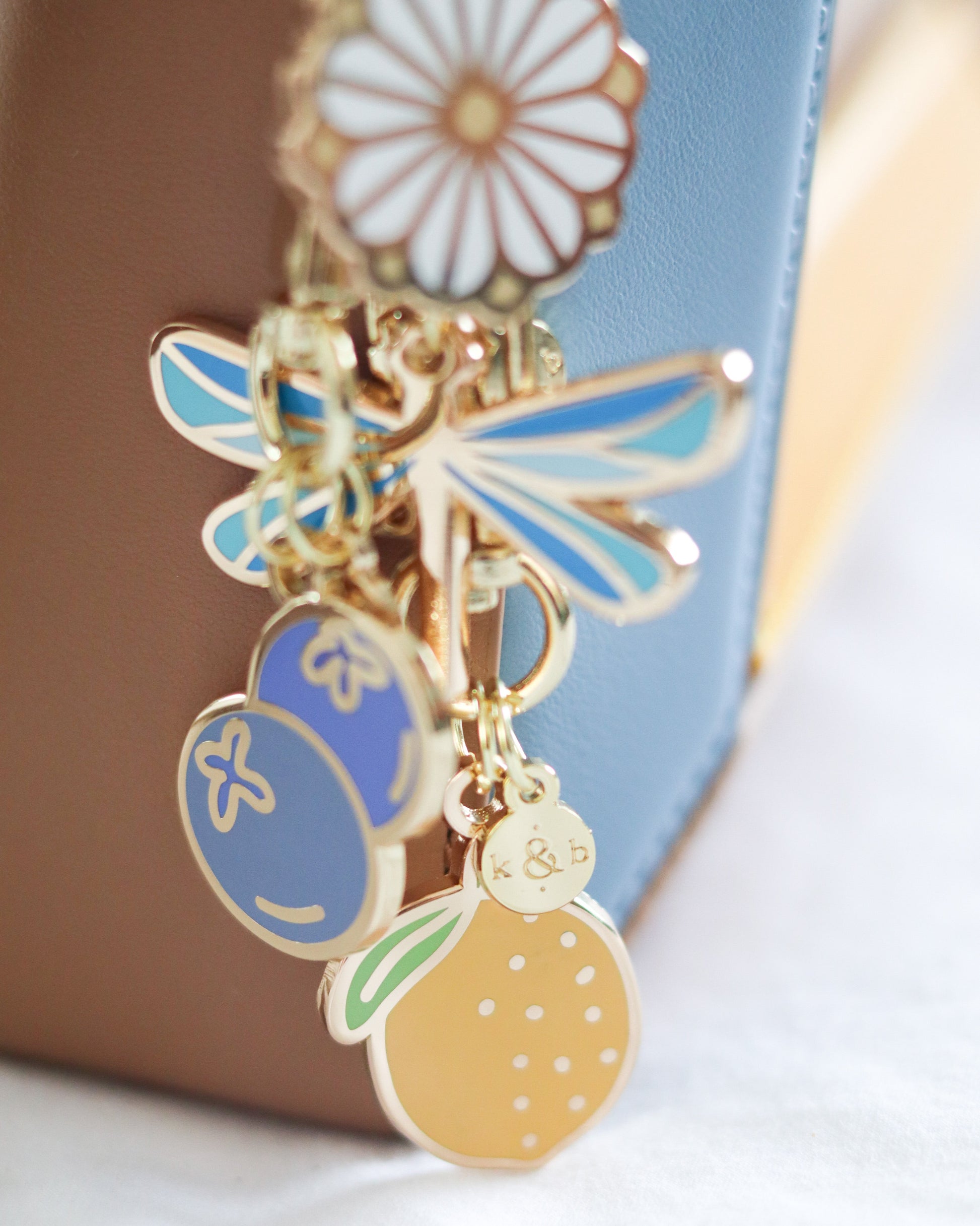 Add a playful shimmer to your pouch, keys, or favorite accessory with our Mini Dragonfly Charm. Made from glossy enamel with gold-toned details, this delicate charm features dreamy shades of blue on its wings, light, airy and full of personality.