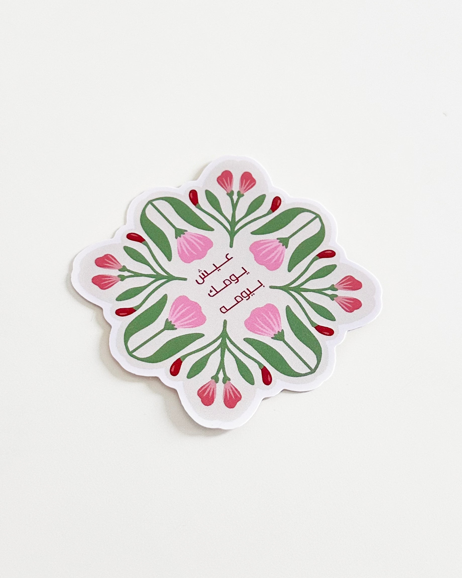 Add a gentle reminder to your day with our Floral Quote Sticker with the phrase "عيش يومك بيومه" — live your life day by day. Designed with soft pink florals, this sticker brings a calming, uplifting touch to your planner, notebook or laptop.