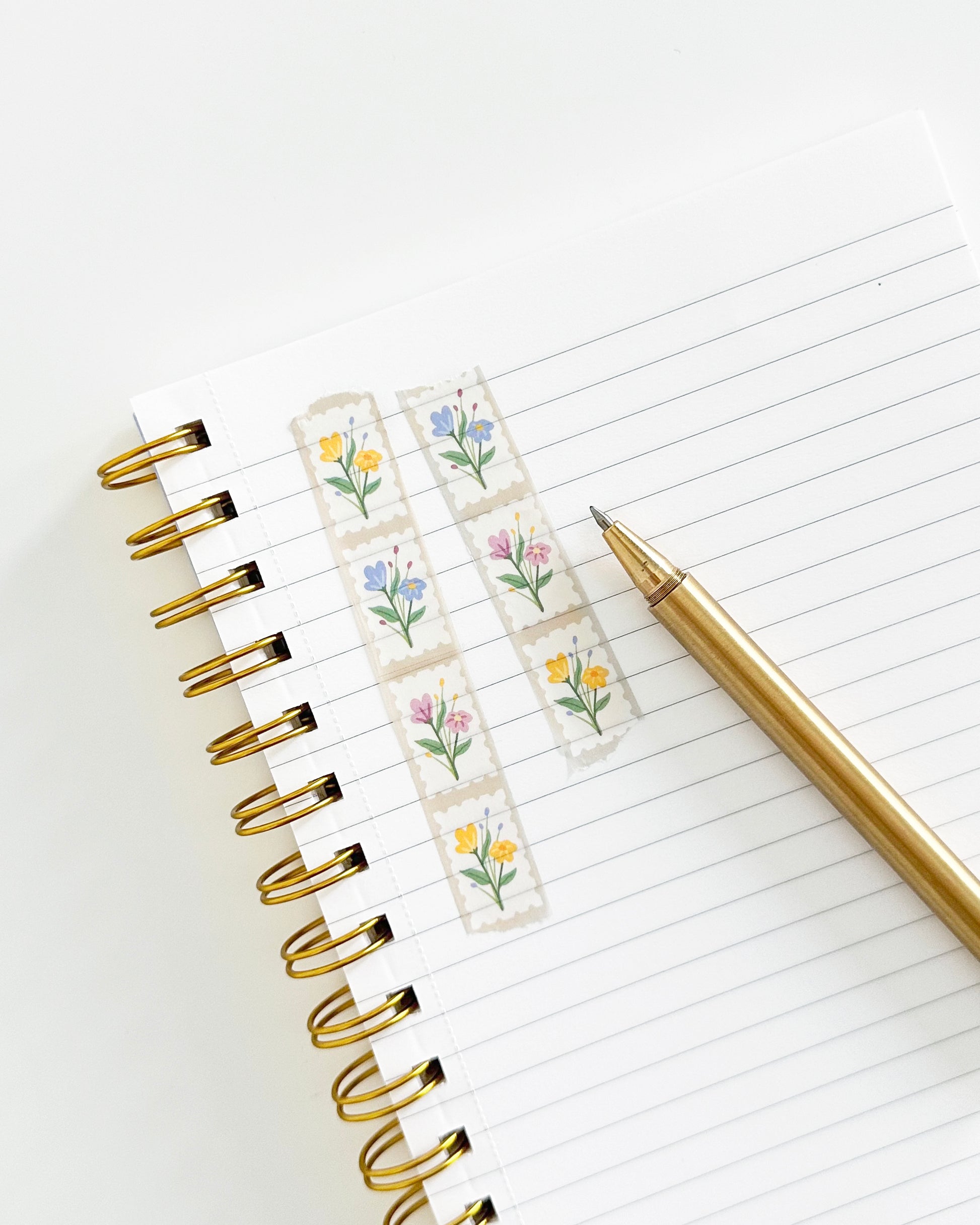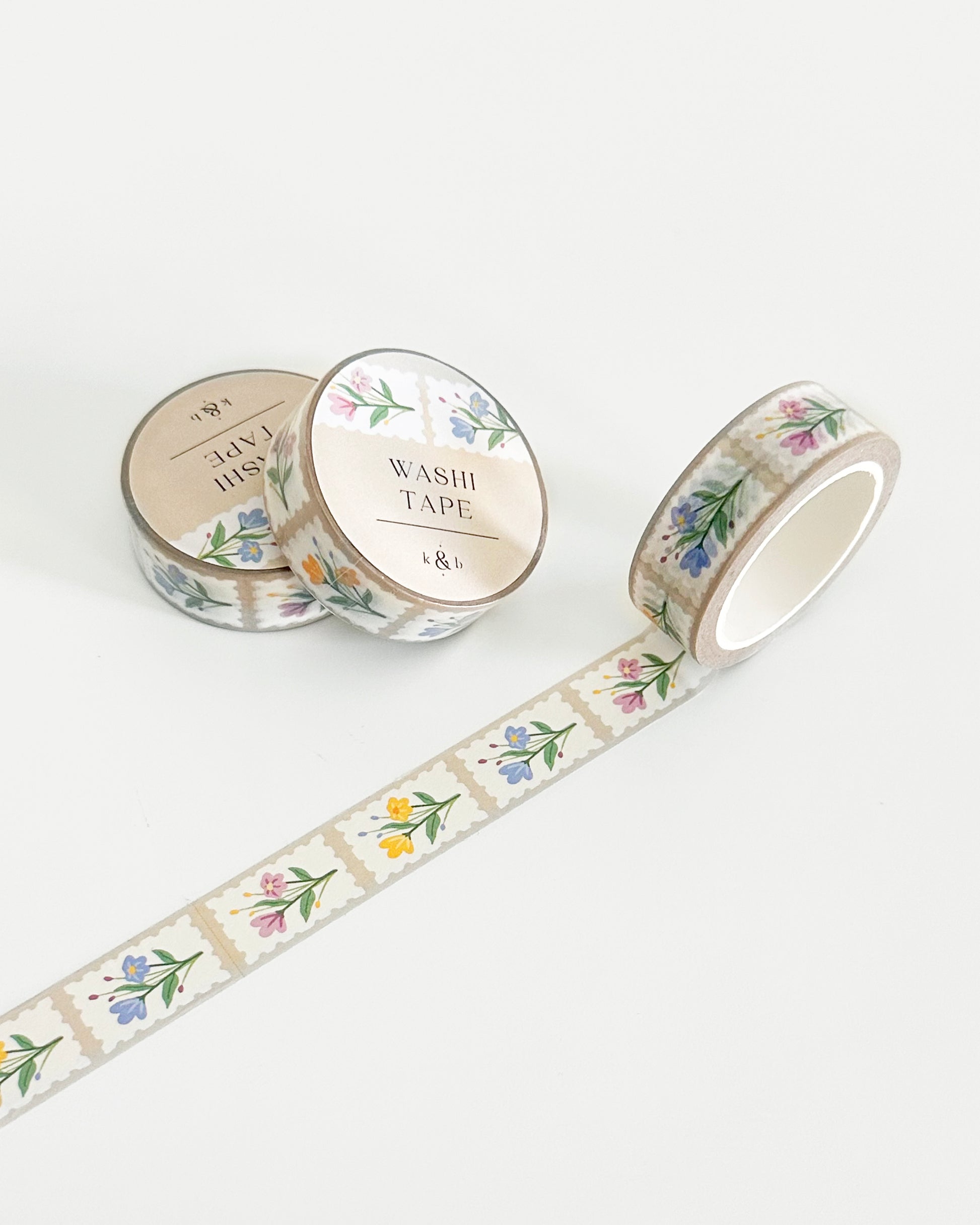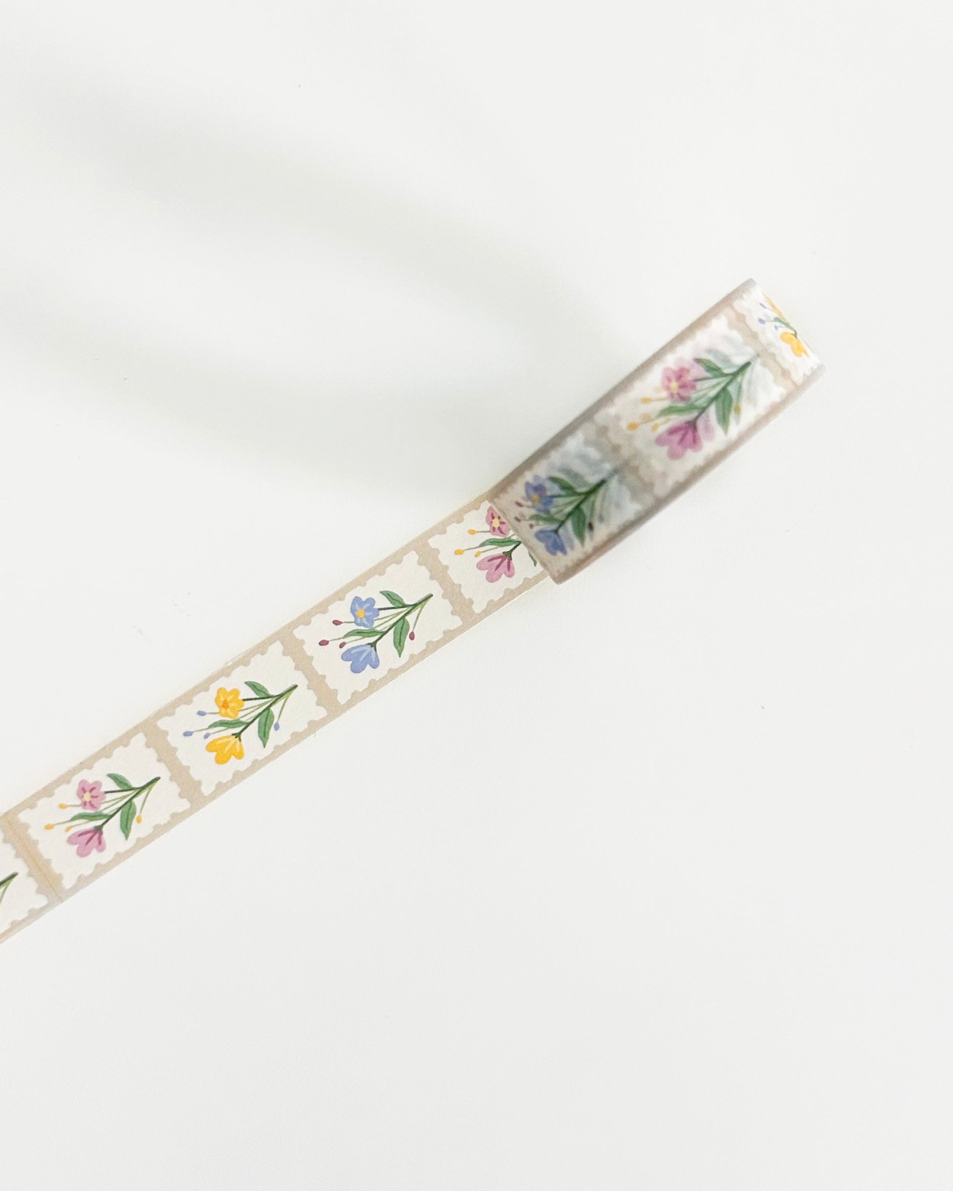 Mini mail stamp shapes with delicate floral patterns, this washi tape adds a charming and whimsical touch to your crafts, planners, and scrapbooks.