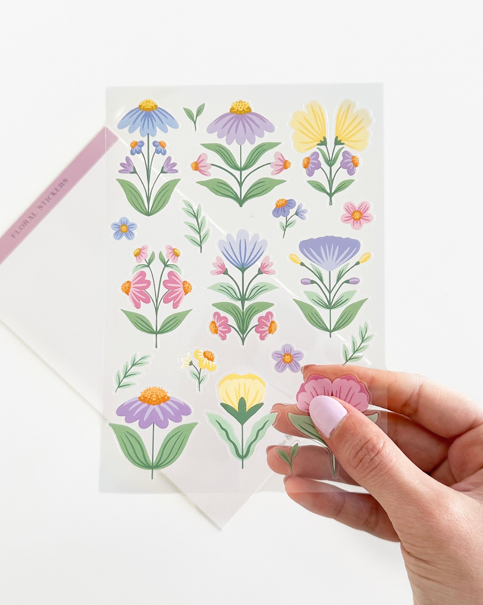 Enhance your stationery collection with our Floral Sticker Sheet. Featuring clear stickers with symmetrical floral designs that perfectly match the patterns on our notebooks, this set includes a beautiful mix of mini florals and delicate leaves.