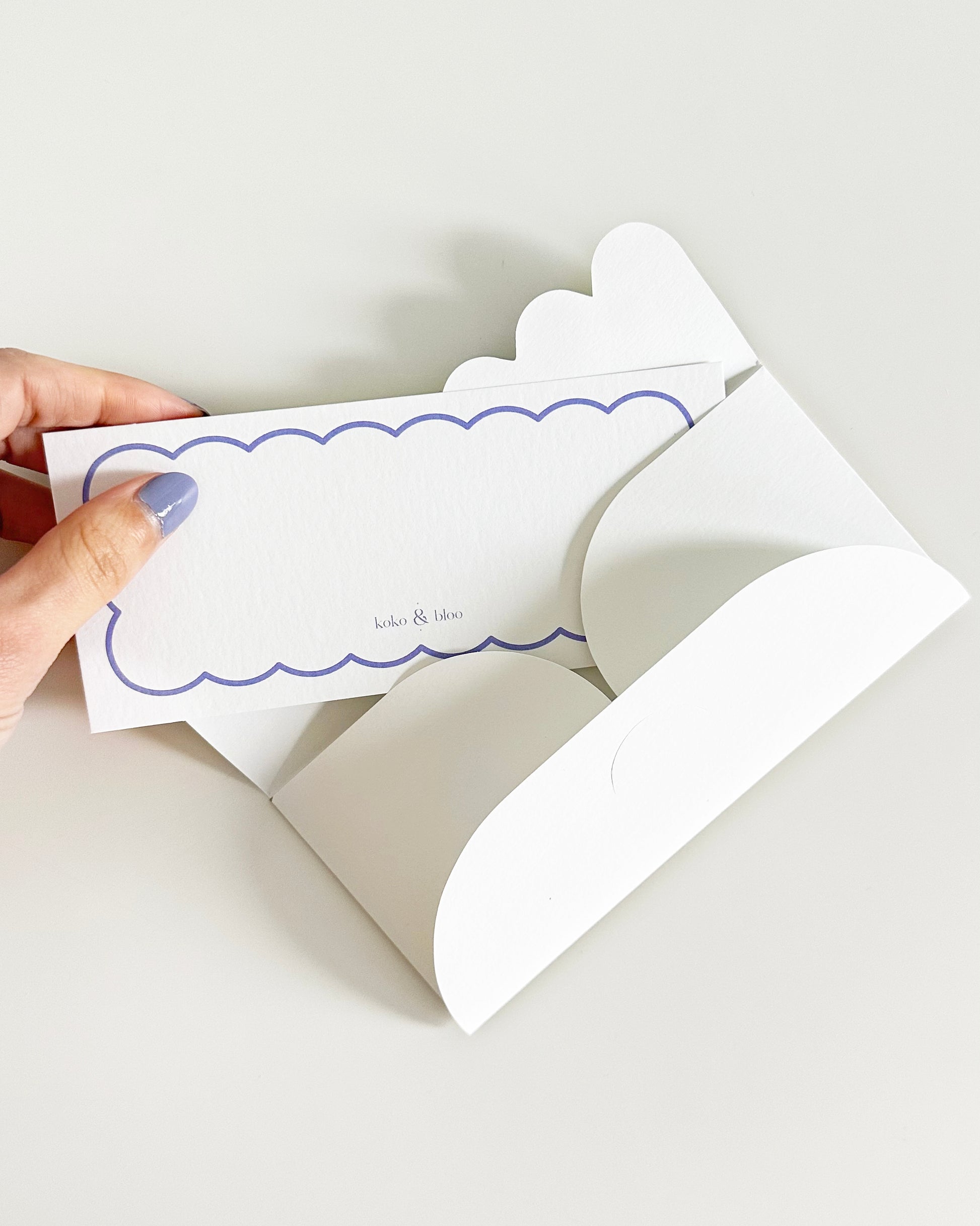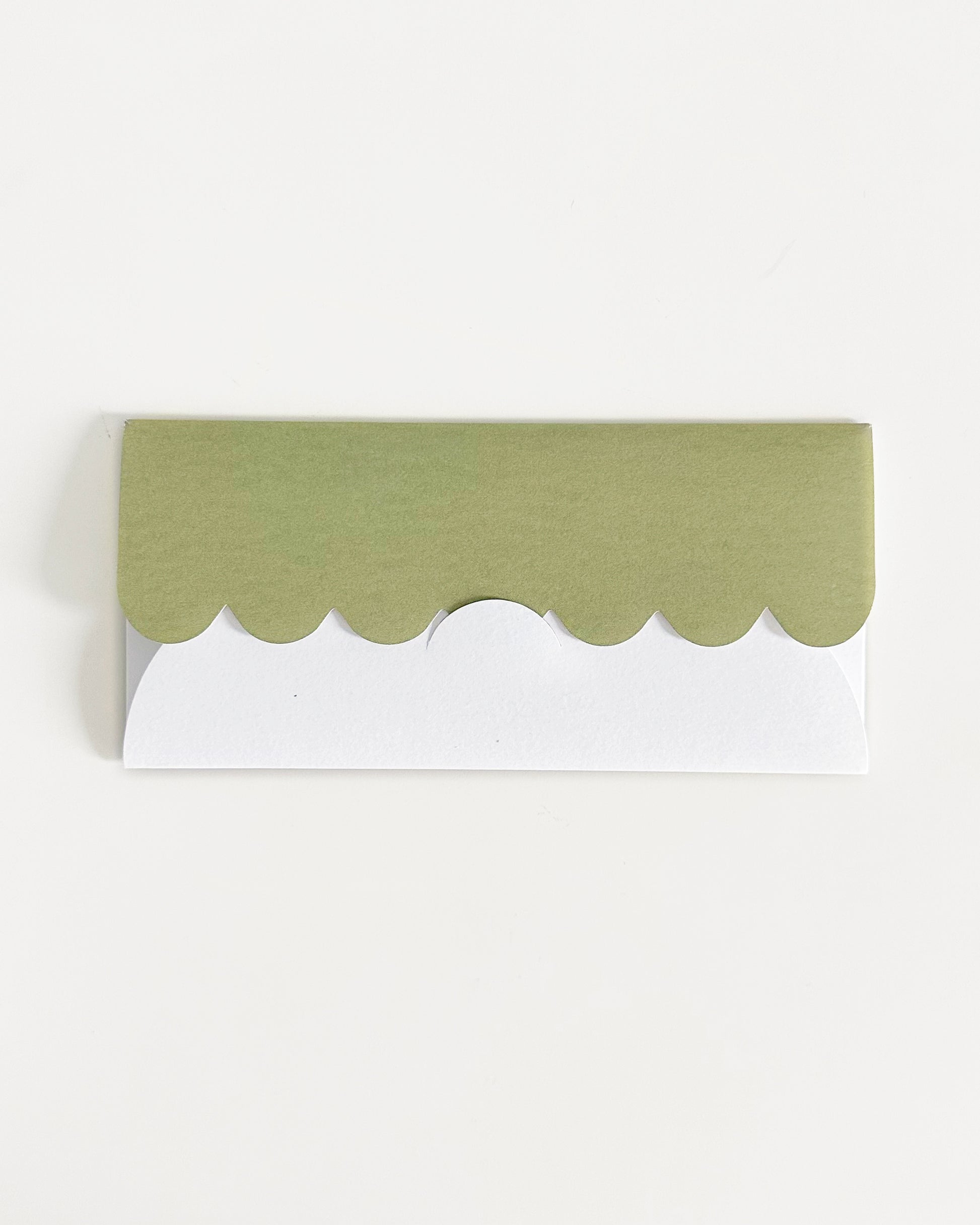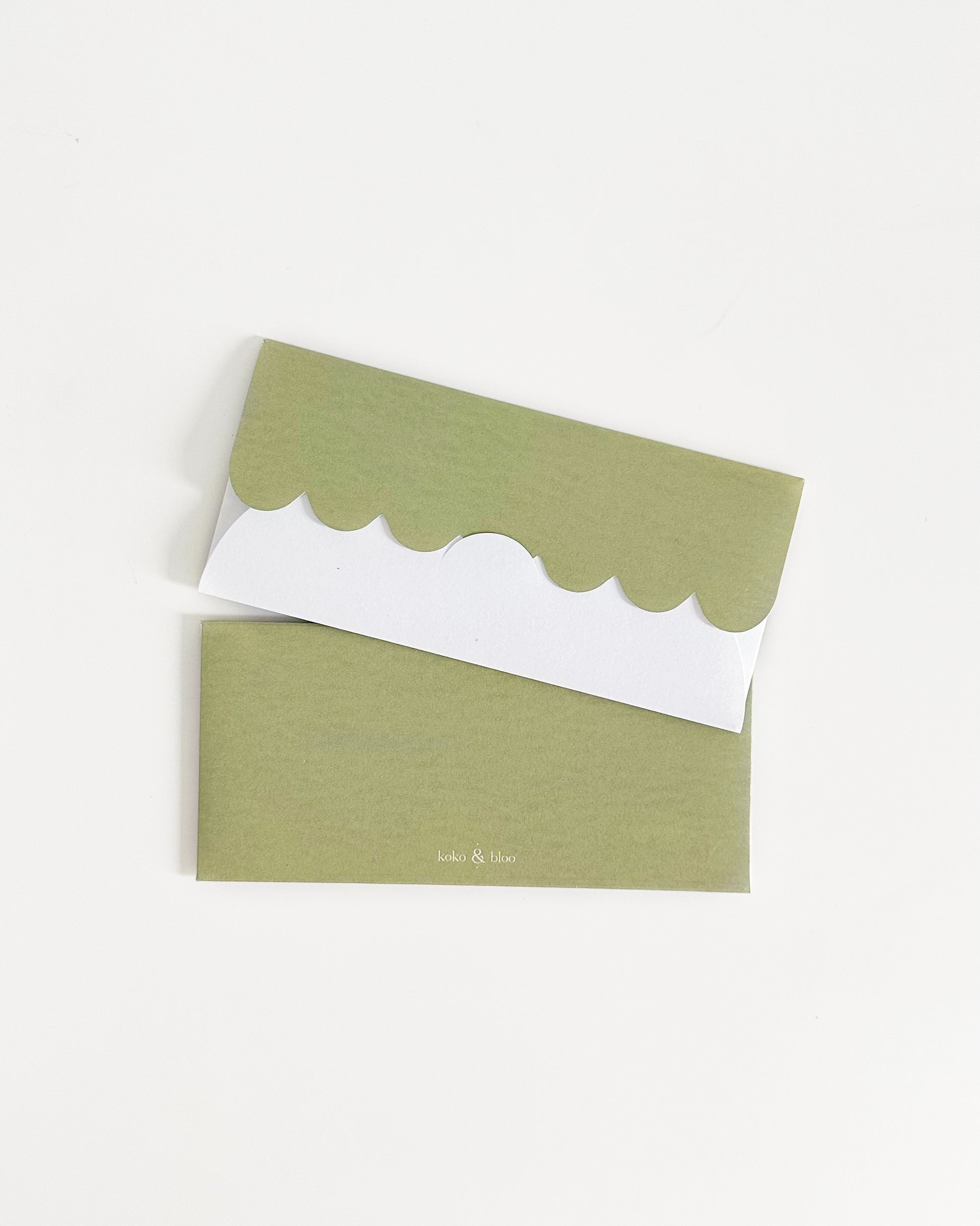 A beautifully minimal gift card set. Each set includes 1 scallop-bordered card and 1 matching envelope. This green and cream envelope is ideal for Eideya cards, birthdays, thank-you notes or any special occasion that deserves a thoughtful touch. Also available as a set of three.