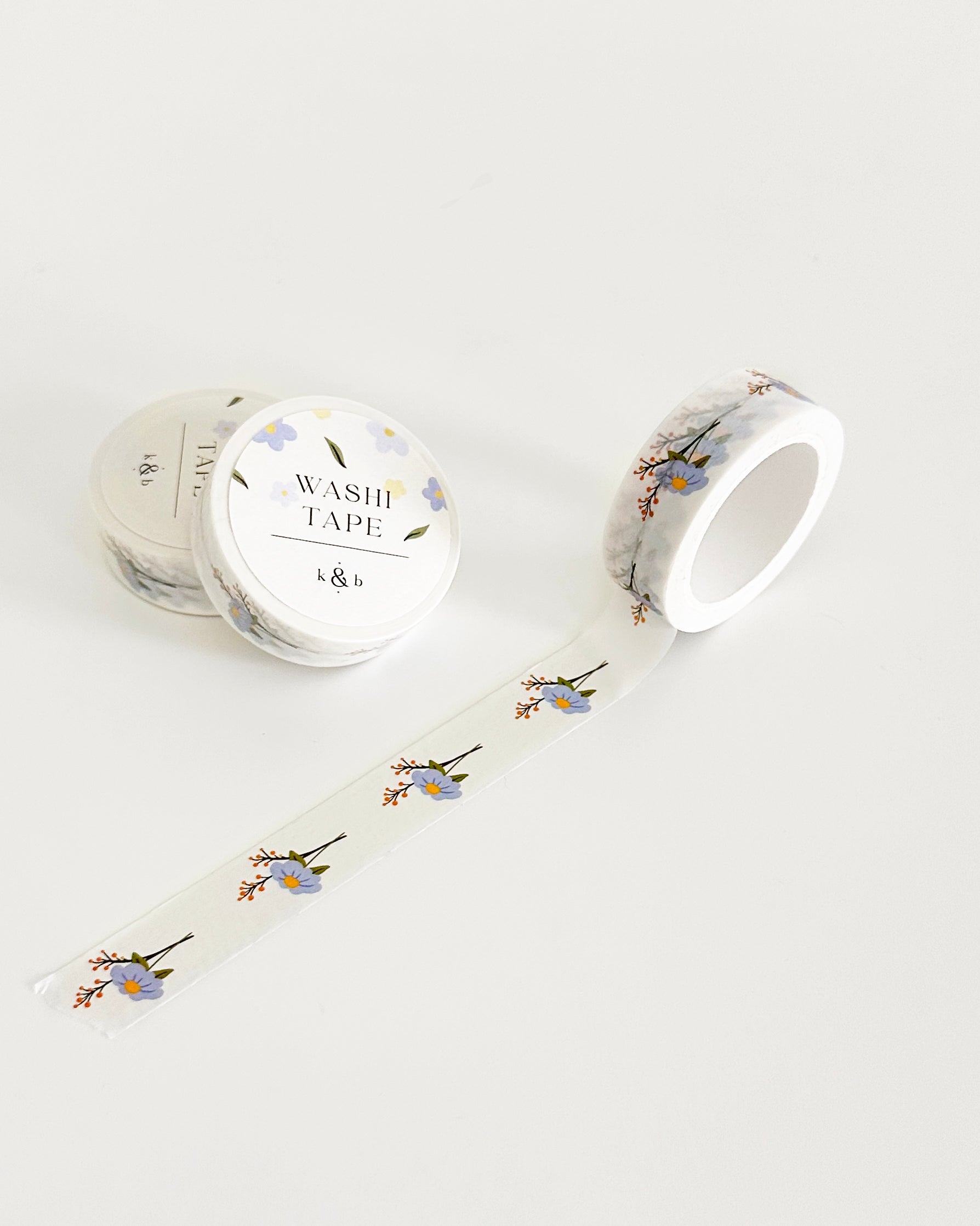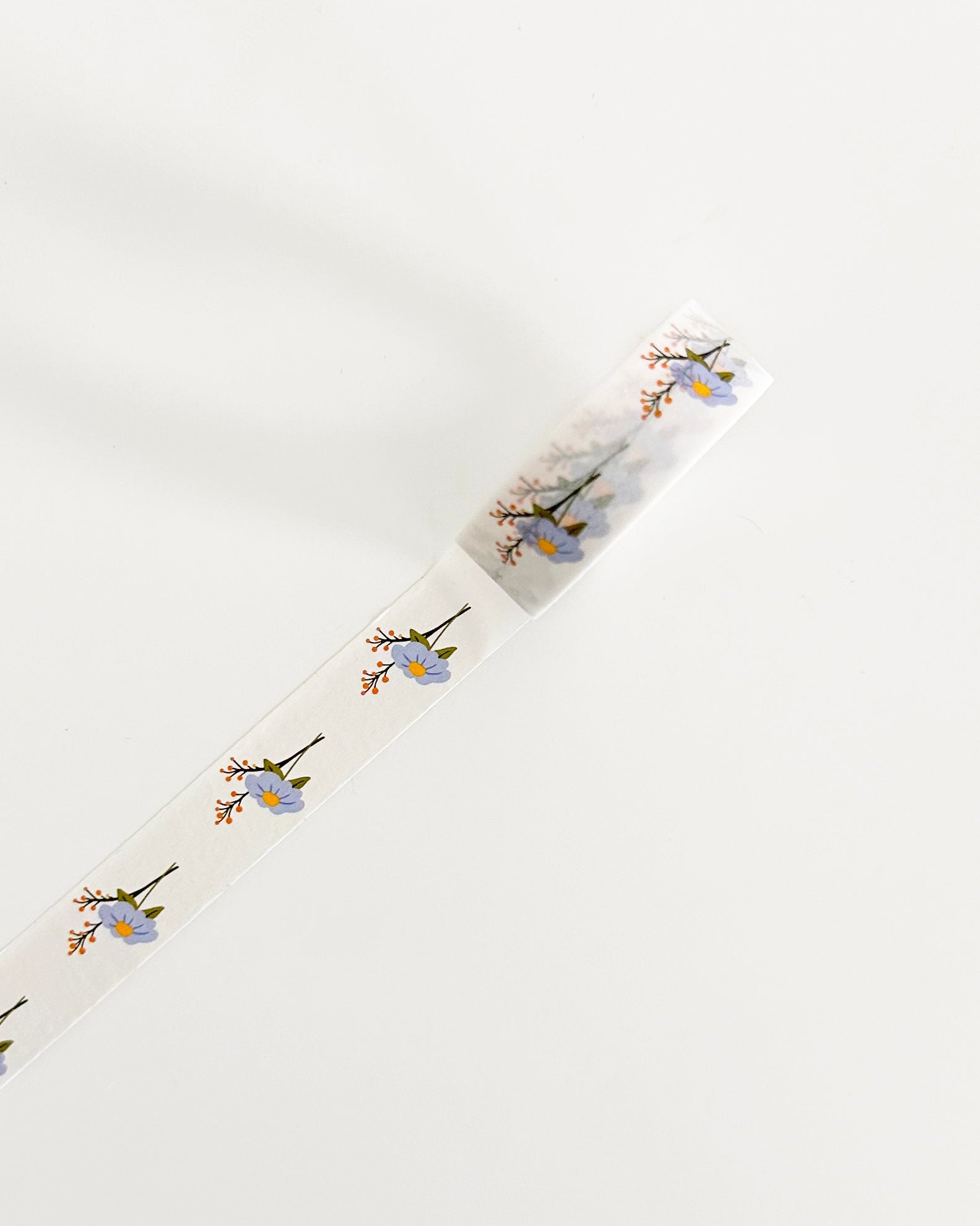 White washi tape with hand-illustrated delicate blue flowers. Great for adding a touch of floral charm to your projects and perfect for crafting and decorating with ease.