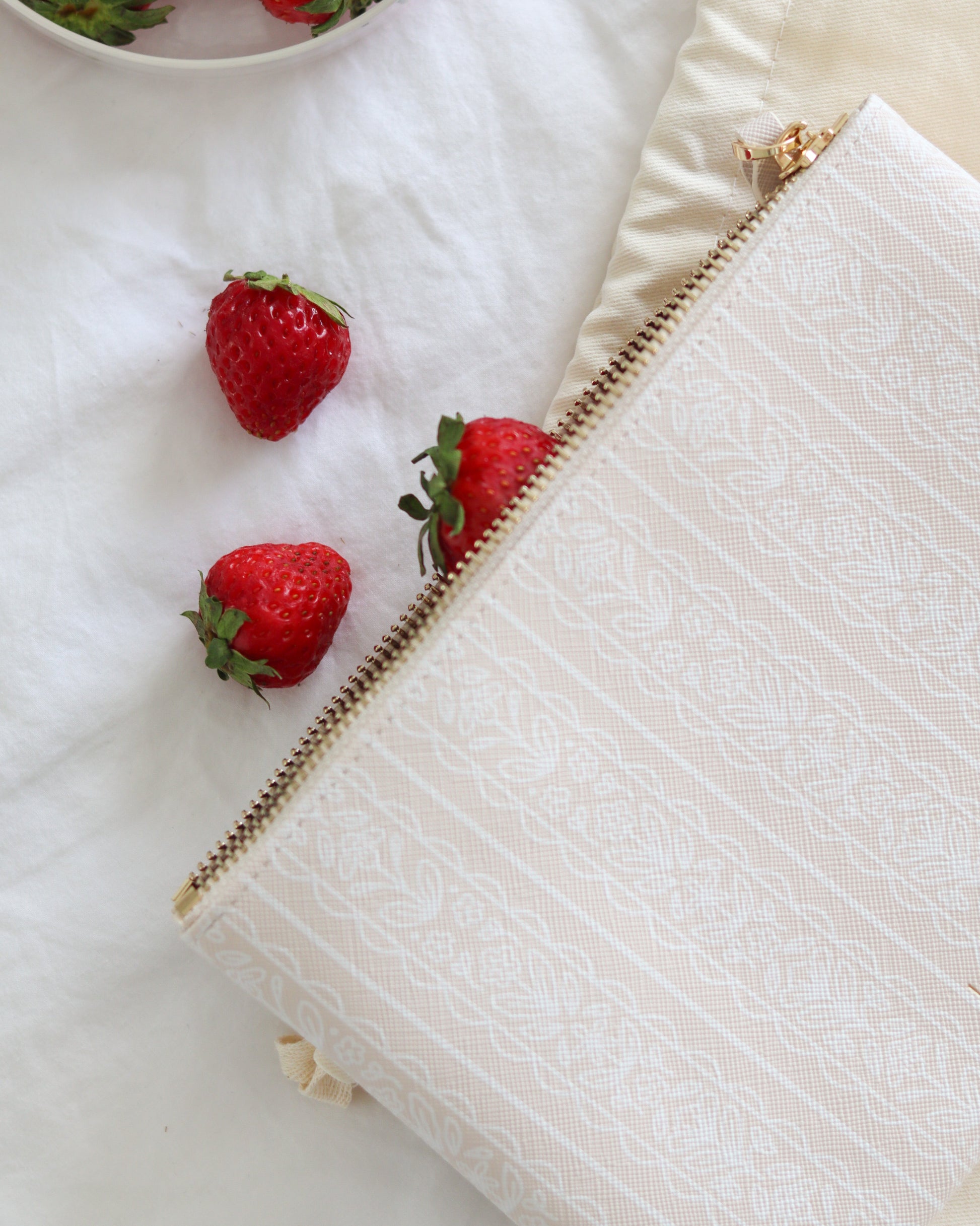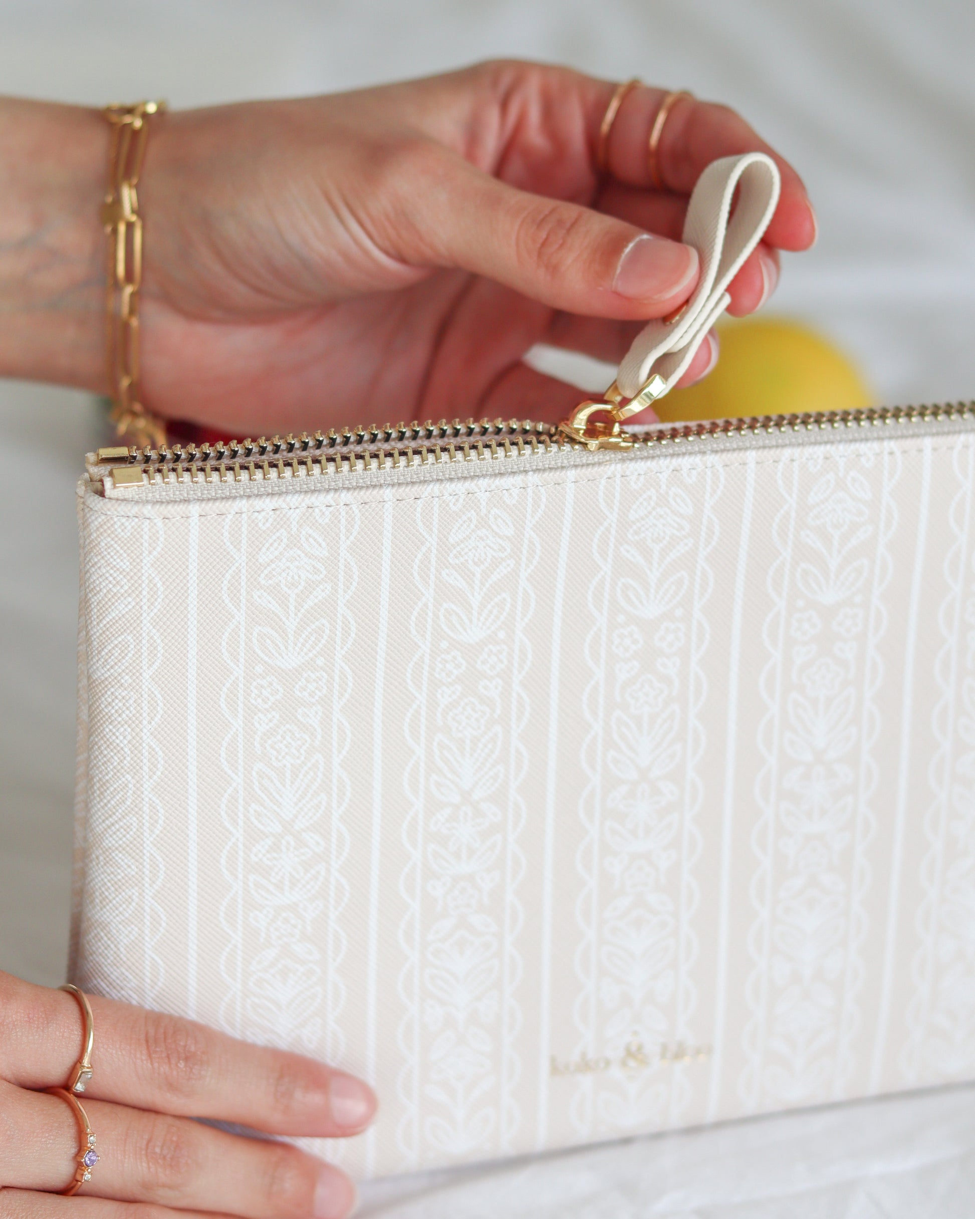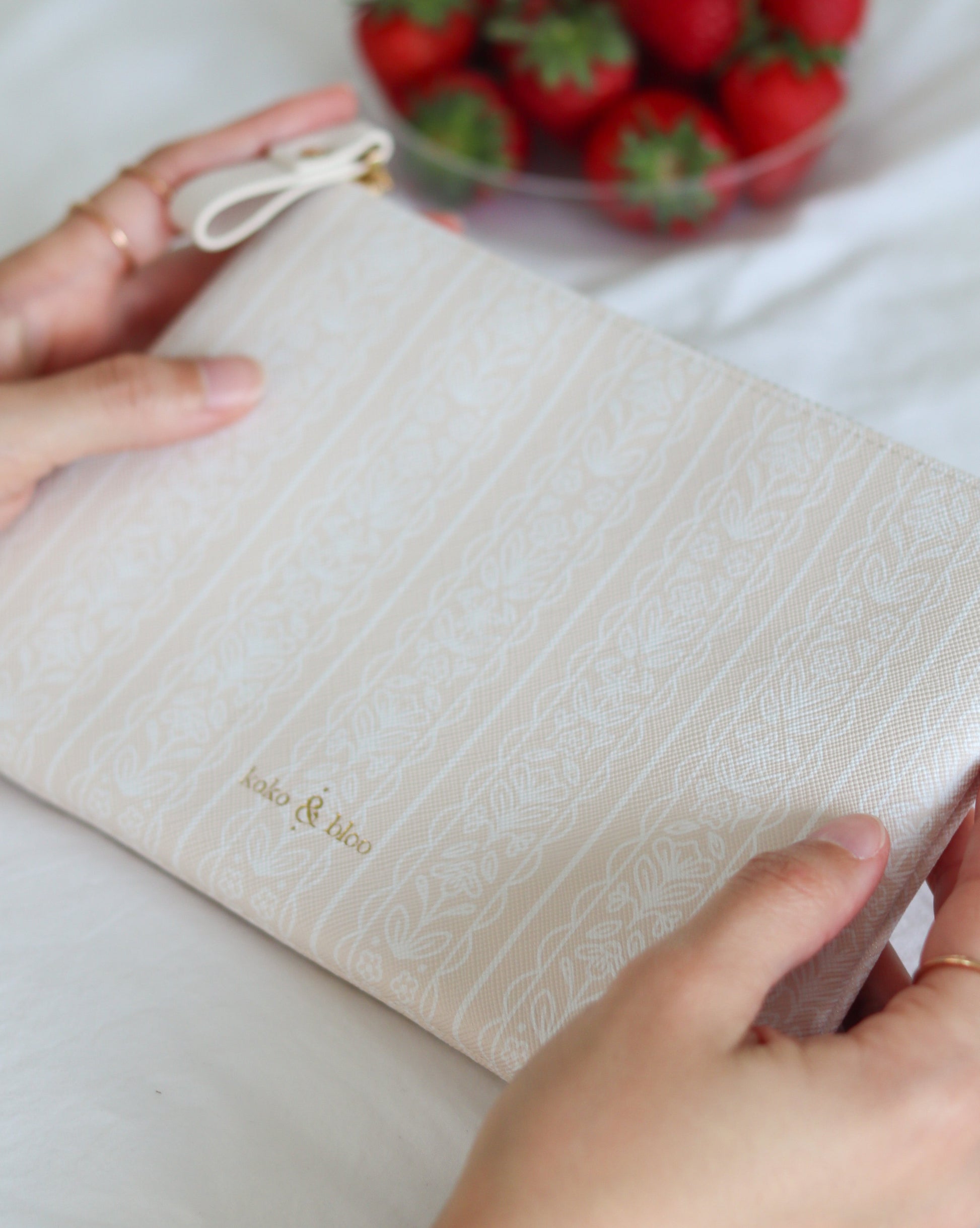 This edition features a soft cream base with delicate white linework, reminiscent of lace, subtle, feminine and beautifully detailed. Whether you use it as a pencil case or travel pouch, it’s made to move with you.